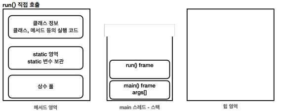 main 스레드가 run() 메서드를 실행했기 때문에 main 스레드가 사용하는 스택위에 run() 스택 프레임이 올라간다.