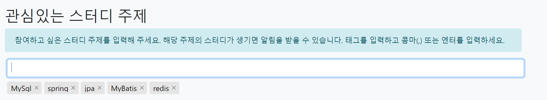 관심주제를 문자열 List로 MODEL에서 넘겨주기 때문에 ${#strings.listJoin(tags,',')}를 사용해서 등록 후 페이지에 조회하게 구현했다.EX) List tags = List.of("Spring", "JPA");