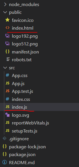 위의 디렉토리 목록처럼 public에서는 화면에 보여지는것이 담길 것이고 src 에선 조작,컴포넌트를 담당하게 될것이다.