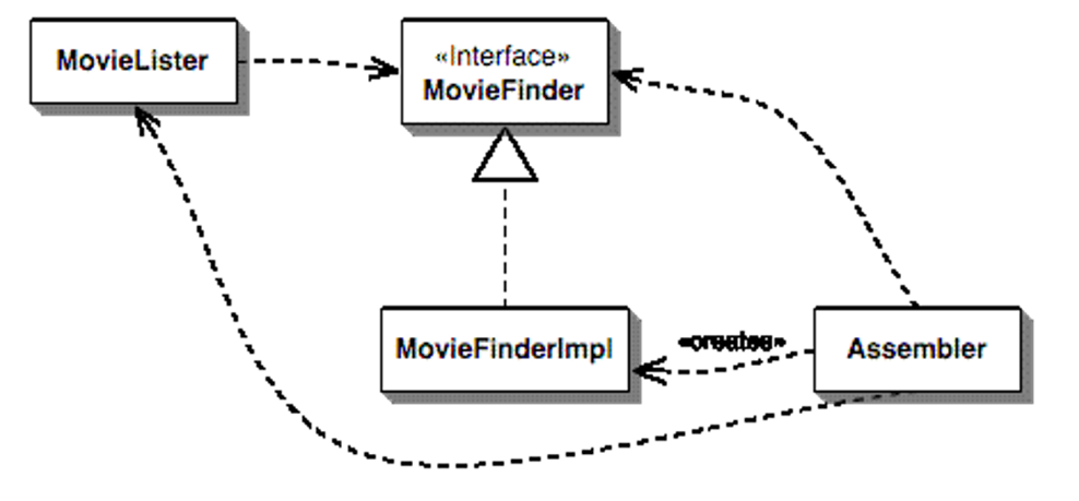 DI의 기본 아이디어는 객체들을 연결해주는 별도의 객체를 갖는 것이다. 이 조립 객체는 MovieLister 클래스에 알맞은 MovieFinder 구현체를 할당해준다.
