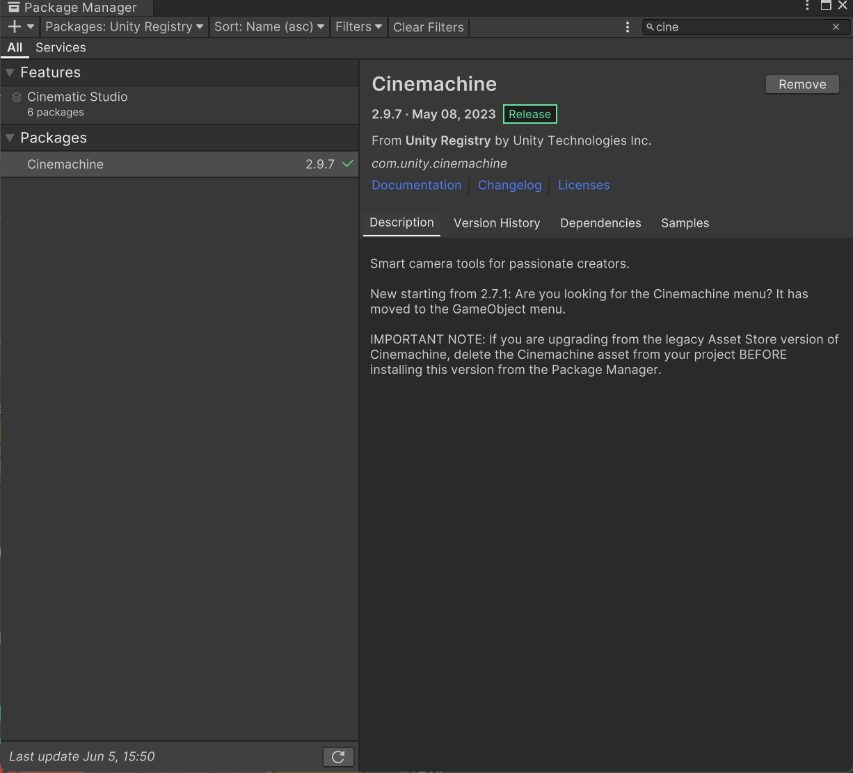 Window → PackageManager → Cineachne Install