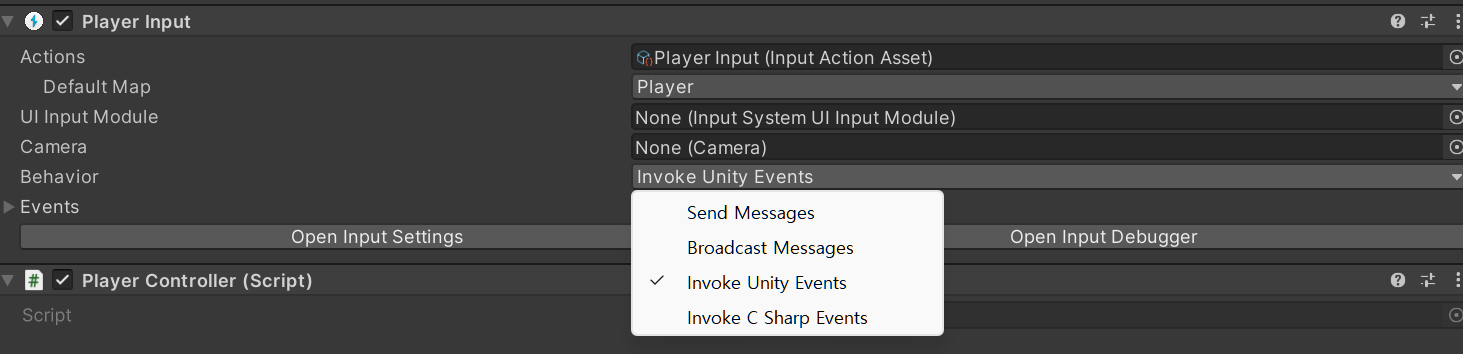 SendMessage : “On + Action name” 인 함수를 찾아서 호출하는 방식이다.Invoke Event : Inspector 상에서 Action에 함수를 설정하고 키 입력이 들어 왔을 때 호출.Invoke C sharp EventsC# 스크립트에서 Invoke Event 과정을 수행.