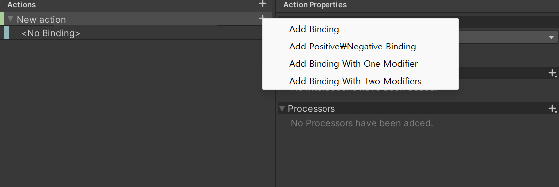 액션을 추가하고, 액션 오른쪽 +를 클릭하면 다음과 같은 바인딩 종류가 나온다.