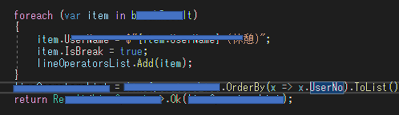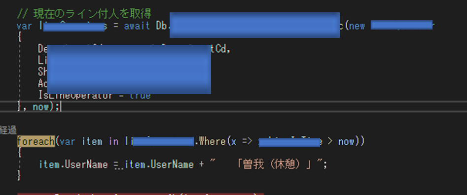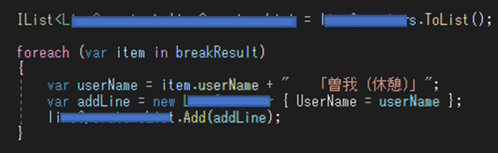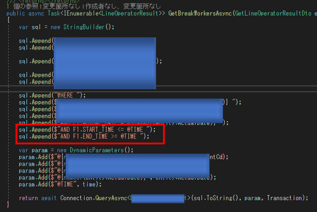 3-3. 새로운 sql메서드를 만들어서 시간을 비교해 userName에 추가했다. 같은 조건의 파라미터를 where에 입력하고 break중인 것을 골라야 하기때문에 현재시간(Time)과 시작시간(StartTime) 종료시간(EndTime)으로 가져온다.
