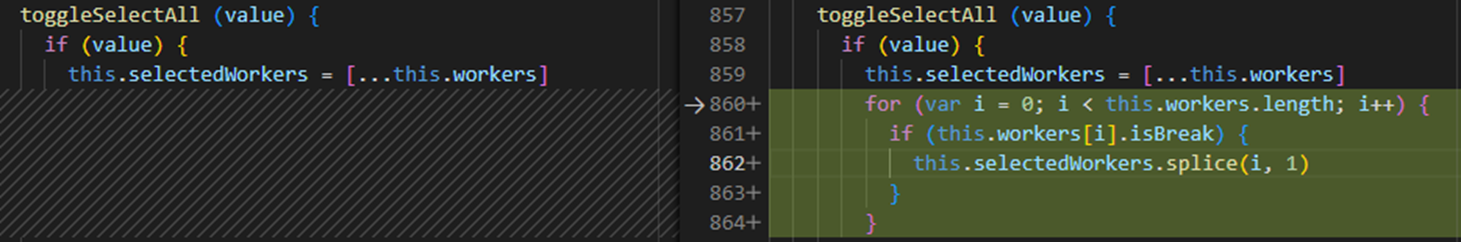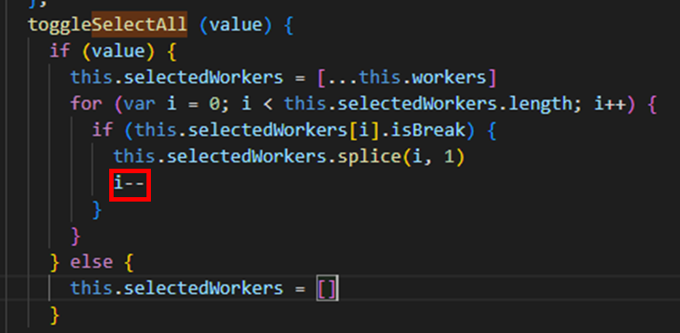 첫번째. For문에 workers가 아닌 selectWorkers이다. 이미 selectWorkers에 workers를 집어넣었고, splice가 작동하는배열이 selectWorkers이기 때문에
