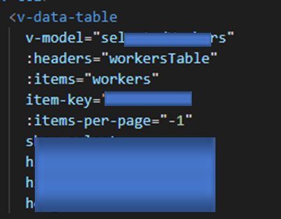 6. vue에서는 IsBreak가 true인것들은 체크가 안되도록 바꾸어야 한다. v-data-table을 사용하였다. Workers에서 서버로부터 request받은 데이터들을 배열로 저장하여 테이블형식으로 나오게한거다.