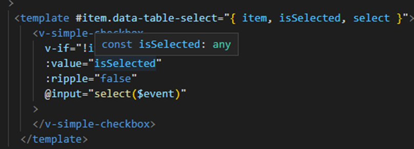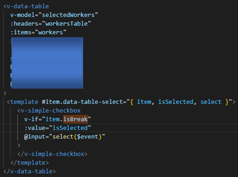 7. 배열 중 IsBreak가 참인것은 체크에 disbled를 하면 될거같다. v-slot을 사용해야 하는지 알았다. isBreak의 값은 읽지만, 체크박스 컨트롤이 안되어 검색을 해보았다. 먼저 체크박스이기 때문에 v-simple-checkbox와 v-data-table값을 사용해야 하므로 template를 사용한다.