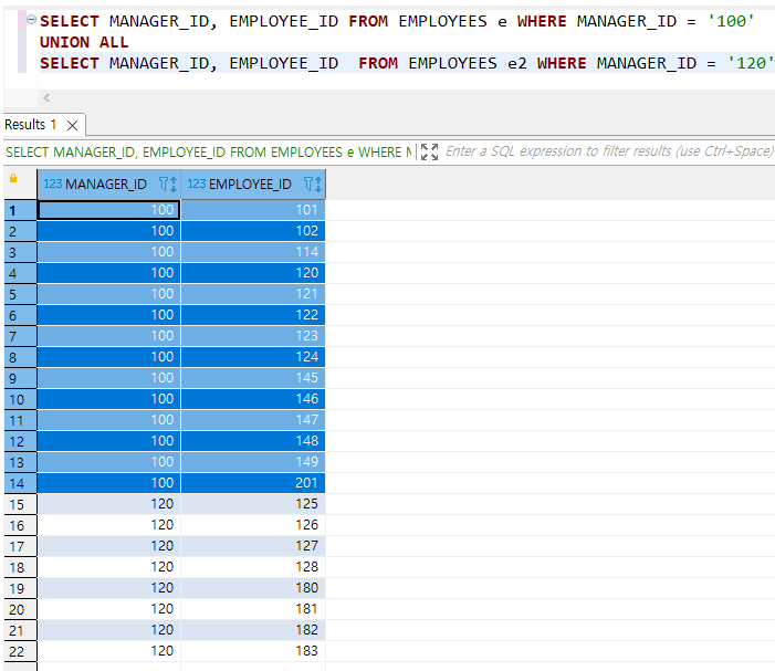 Union UnionAll은 같은기능이지만, 중복값을 제거 하느냐 안하느냐 차이이다. UnionAll은 중복값을 제거하지 않는다!