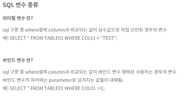 바인드 변수 처리는 쿼리구문에 입력하는 값을 파라미터로 집어넣는 것을 말한다. 말로 설명보다는 다음 예제가 더 확실하다.