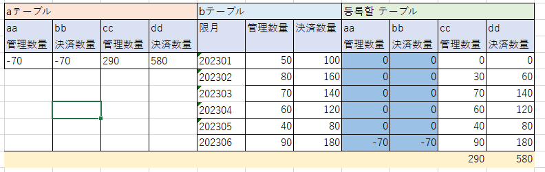 위와같은 그림에서 a테이블에 값이 음수인 경우는 무조건으로 최근날짜 기준의 값에 음수를 넣은 후 나머지 날짜 레코드에는 0을 집어넣는다.