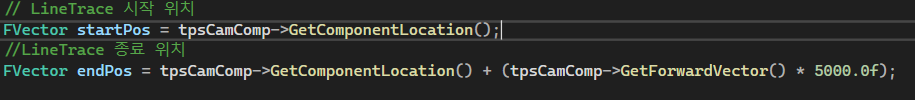 처음 FVector로 시작 지점과 끝 지점을 정해준다.