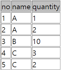 SELECT MIN(no),name,SUM(quantity)