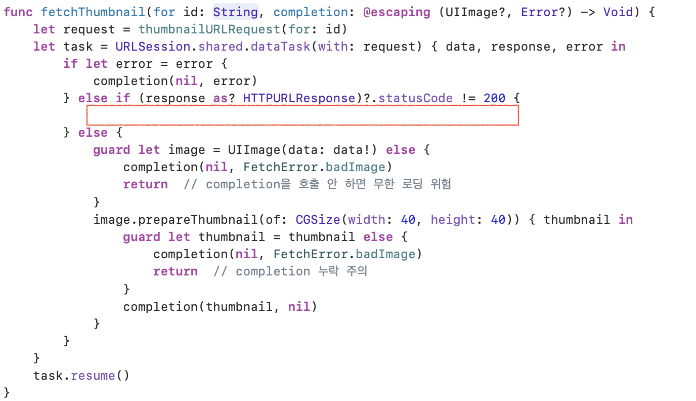 guard 문에서 completion 호출을 깜빡하면 무한 로딩"Swift에게 completion handler는 그저 클로저일 뿐입니다. 우리는 이 클로저가 항상 호출되기를 바라지만, Swift에는 이를 강제하는 방법이 없습니다."
