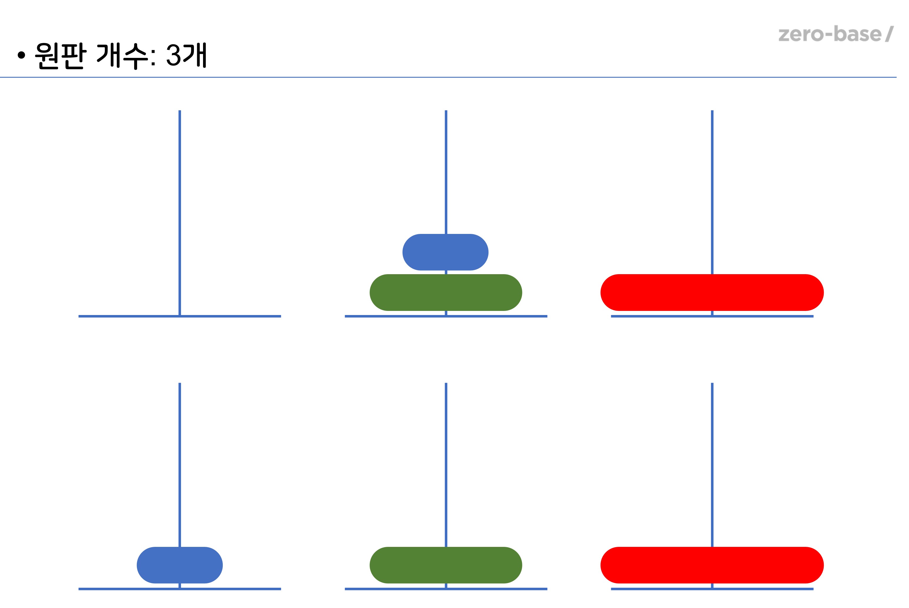 - 한 번에 한개의 원판만 옮길 수 있다.