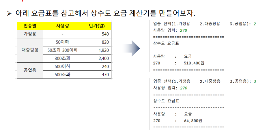 useSelect = int(input('업종 선택(1.가정용 2.대중탕용 3.공업용):'))
