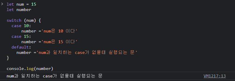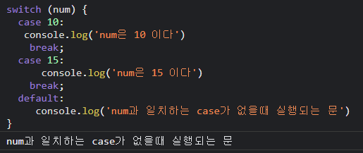 - 표현식과 일치하는 case문이 있을경우 break문을 사용하여 switch문을 탈출한다.