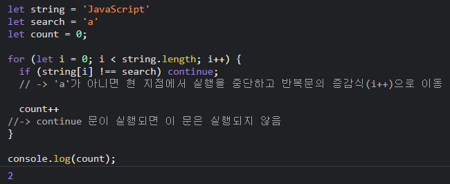 - 반복문의 코드 블록 실행을 현 지점에서 중단하고 반복문의 증감식으로 실행 흐름을 이동시킨다.