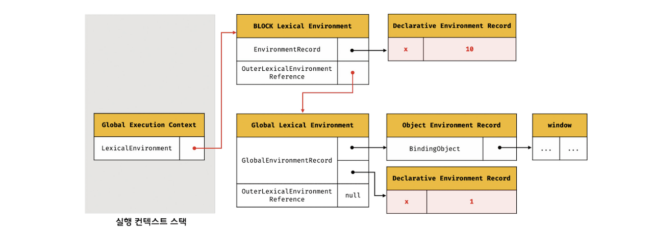 이때 새롭게 생성된 if 문의 코드 블록을 위한 렉시컬 환경의 외부 렉시컬 환경에 대한 참조는 if 문이 실행되기 이전의 전역 렉시컬 환경을 가리킨다.