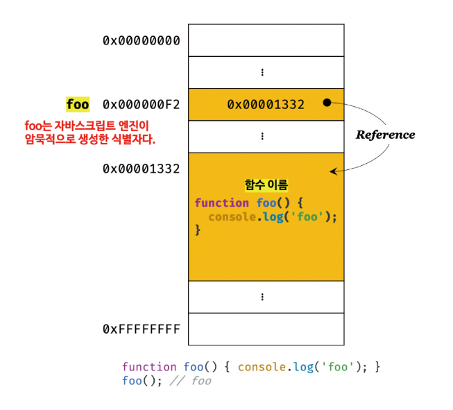 - 함수 선언문은 생성된 함수를 호출하기 위해 함수 이름과 동일한 이름의 식별자를 암묵적으로 생성하고, 거기에 함수 객체를 할당한다.