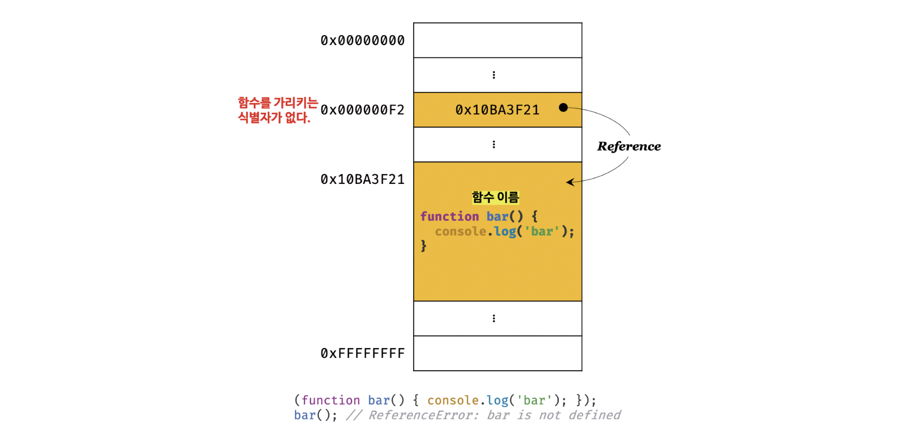 - 함수 리터럴로 생성된 함수는 함수를 가리키는 식별자가 없으므로 bar함수는 호출할 수 없다.