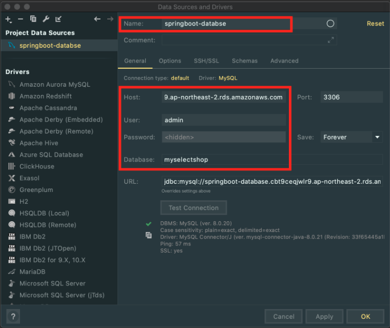 - test connection 후 연결