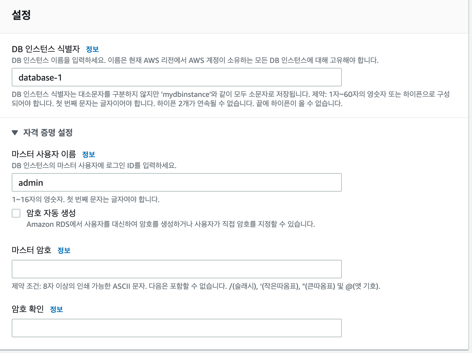 - 설정 -> DB 인스턴스 식별자, 마스터 사용자 이름, 마스터 암호 입력