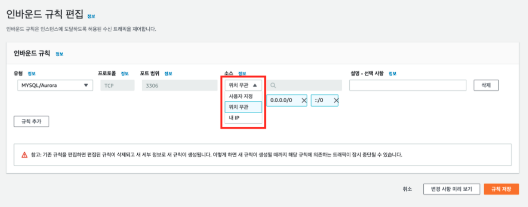 - 소스 -> 위치 무관 클릭 후 0.0.0.0/0, ::/0 생성 확인 후 저장