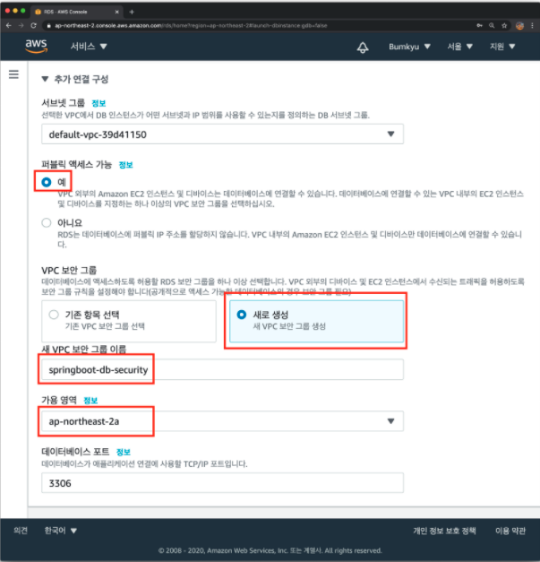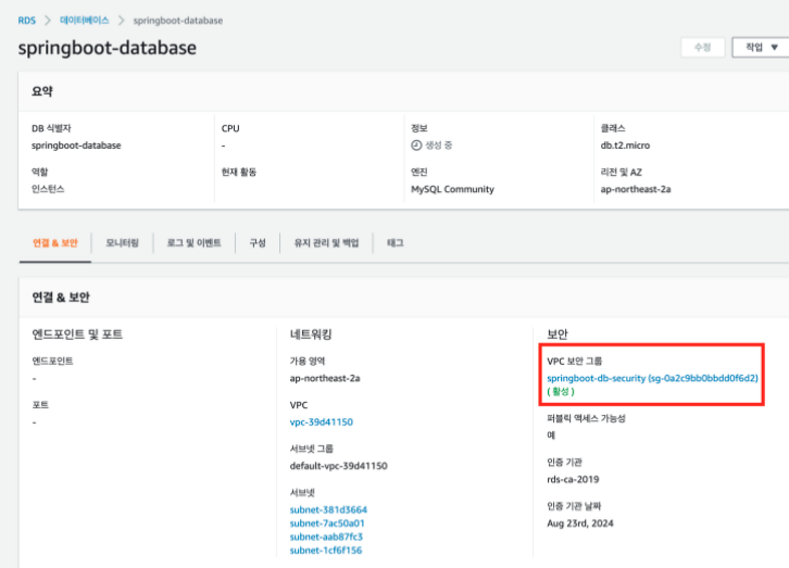 - 연결 & 보안 -> 보안 -> VPC 보안 그룹에서 이전에 생성한 VPC 보안 그룹 선택