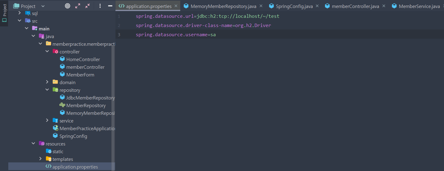 기존에 MemberRepository의 구현체는 자바의 메모리를 사용한 MemortMemberRepository였지만 이번에는 Jdbc를 사용하여 직접 H2 데이터 베이스에 넣어주도록 구현하고자 한다.