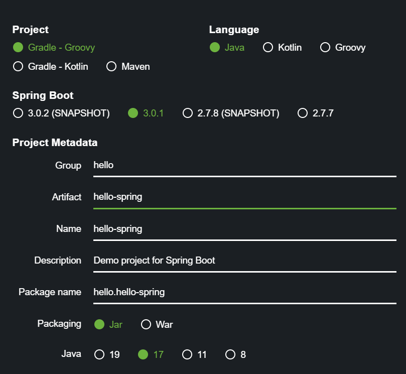 프로젝트 정보를 다음과 같이 수정하자. 앞서 언급한대로 스프링부트 3.XX부터는 자바17버전 이상을 사용하여야 한다.