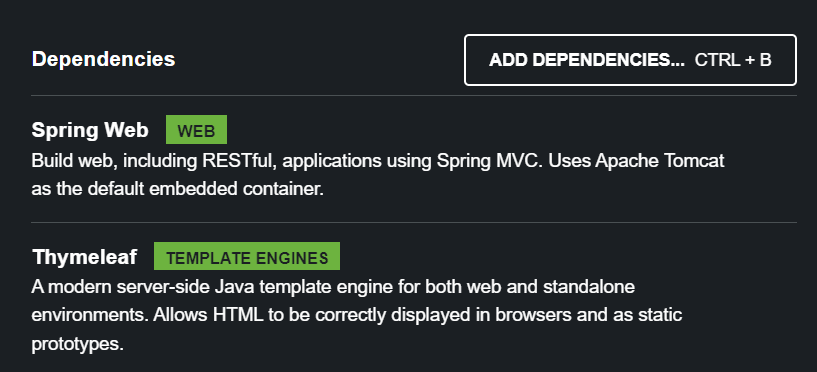 Spring Web은 스프링 웹개발에 대한 전반적인 기능을 제공하는 라이브러리이며 Thymeleaf는 템플릿 엔진이다.