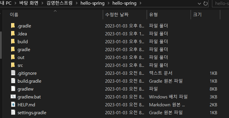 바탕화면에 프로젝트를 생성하는 버릇 좀 버려야되는데 잘 안된다. 아무튼 압축해제를 하고 나면 위와 같은 폴더와 파일들이 보일텐데 IntelliJ를 써봤다면 흔하게 봤을 계층구조이다. 해당 위치에서 마우스 우클릭 후 IntelliJ로 열기를 눌러 실행하자.
