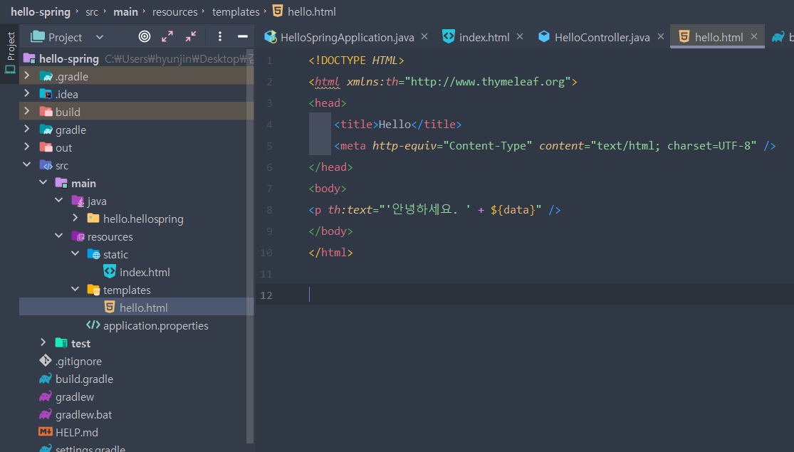 templates폴더 안에 우리가 추가한 thymeleaf를 이용하여 /hello에 대한 페이지를 작성하여보자.