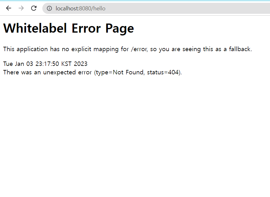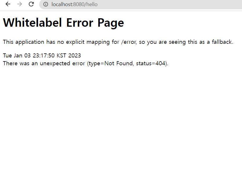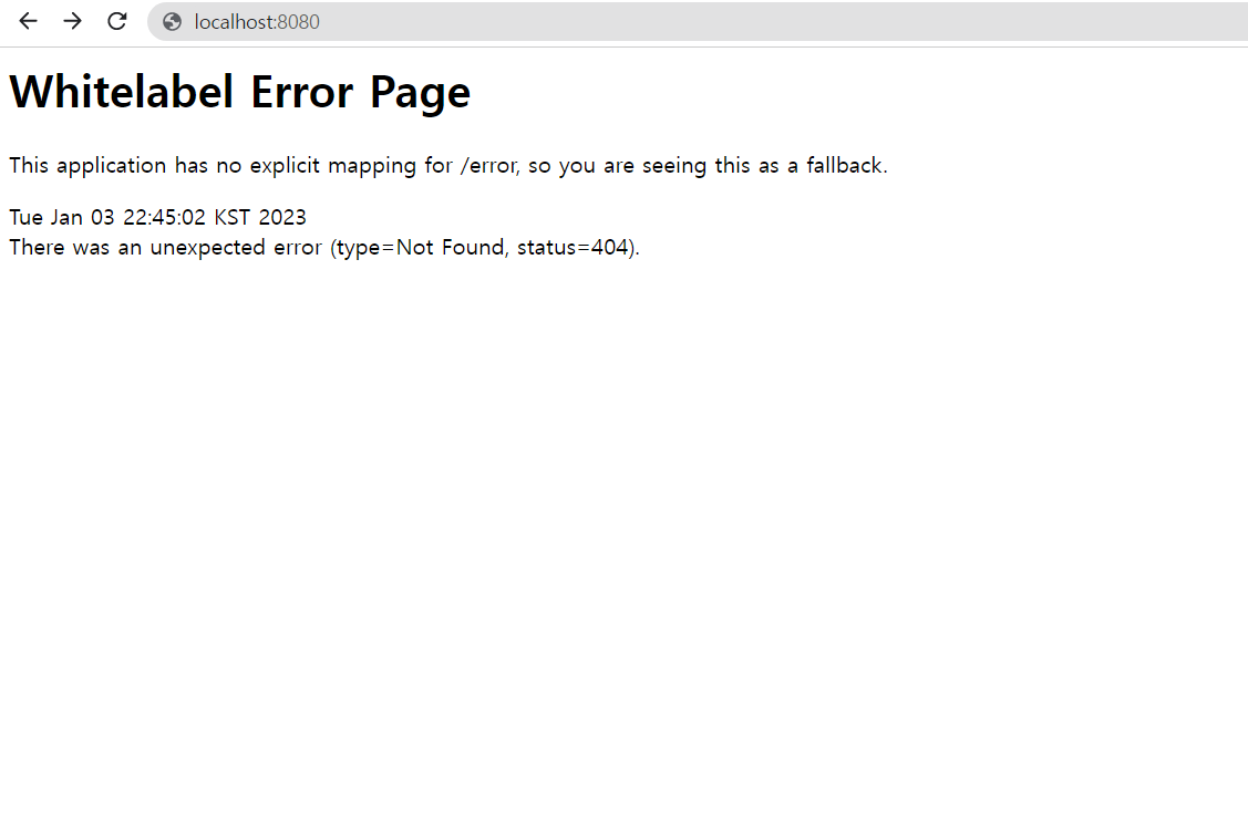 아무것도 구현하지 않았으므로 에러페이지가 뜨는 것이 당연하다.