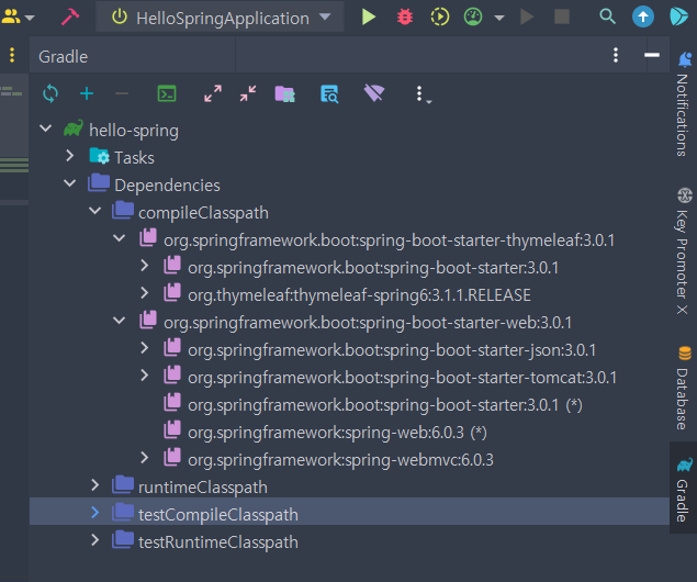 우리가 Dependencies로 추가한 Spring Web과 Thymeleaf의 패키지 구조를 확인해 볼 수 있다. 간략히 확인해보면 spring-boot-starter가 두 라이브러리에 공통적으로 포함되어 있는 것을 확인해 볼 수 있으며 Spring Web에는 특히 tomcat파일과 spring-web, spring-webmvc가 깔려있는 것을 확인할 수 있다.