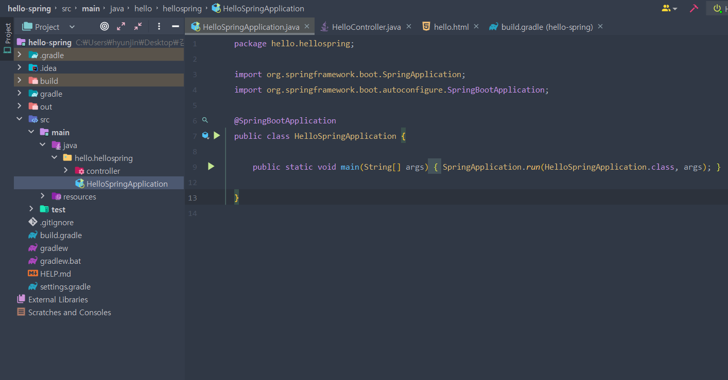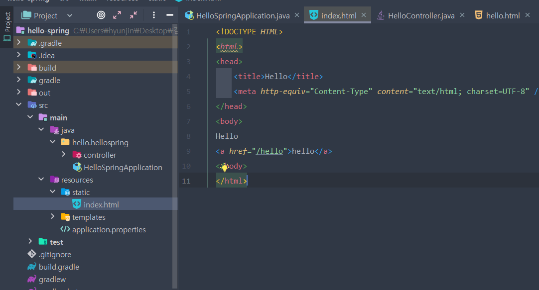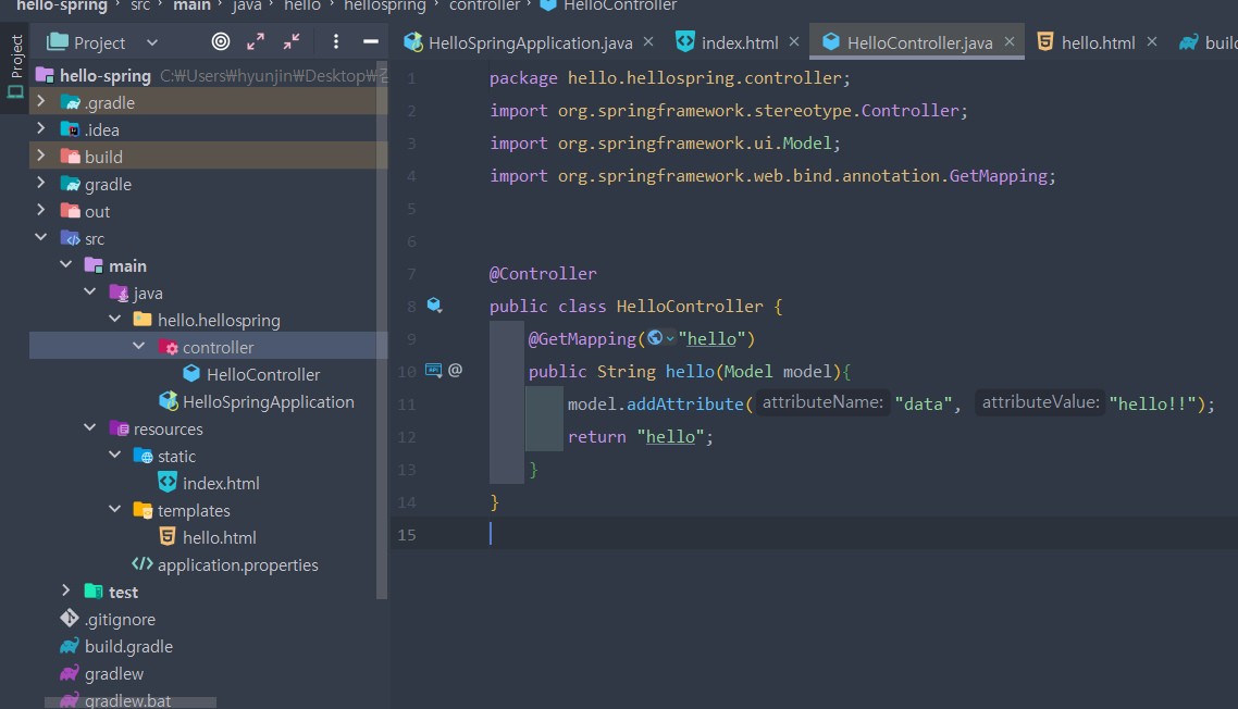 또한 컨트롤러에서 "hello" 라는 문자열을 반환하면 이 문자열은 viewName으로써 동작한다. 그럼 ViewResolver에서 "hello"라는 이름의 html파일을 templates폴더에서 찾아 화면에서 찾아 보여주게 된다.