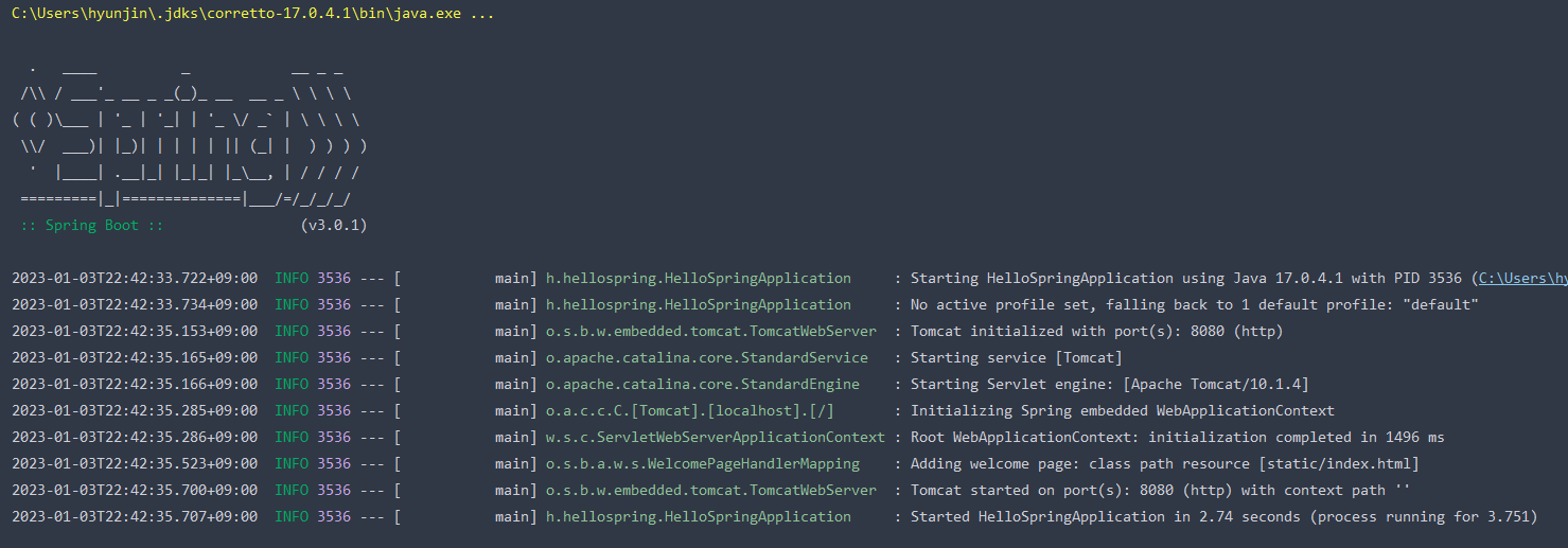 사실 영상을 보면서 진행할 때 버전문제 관련 오류를 겪고 싶지 않아 2.7.7 버전을 선택해서 실습을 진행하려 하였으나 2.7.7 역시 JAVA 17이상을 요구해서 그냥 JAVA 17을 새로 깔고 스프링부트 3.0.1로 실습을 진행하였다.