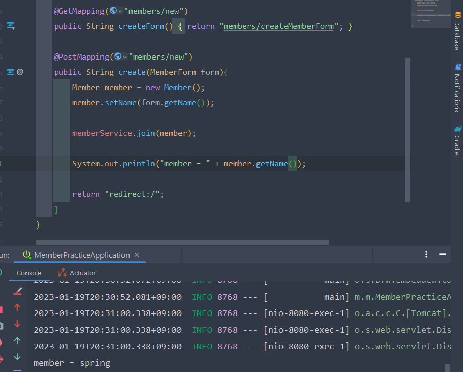 MemberController에서/members/new에 대해PostMapping된create메소드가 동작한다.