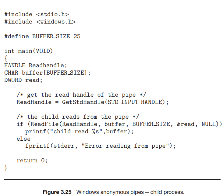 자식 프로세스를 만드는 프로그램은 그림 3.10의 프로그램과 비슷하지만, 다섯 번째 매개변수가 TRUE 로 설정되어 자식 프로세스가 부모로부터 지정된 핸들을 상속받게 된다. 파이프에 쓰기 전에 부모는 먼저 파이프의 사용되지 않는 읽기 끝을 닫는다. 파이프에서 읽는 자식 프로세스는 그림 3.25에 나와있다. 파이프에서 읽기 전에 이 프로그램은 GetStdHandel() 을 호출하여 파이프에 대한 읽기 핸들을 얻는다.