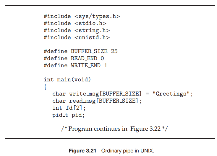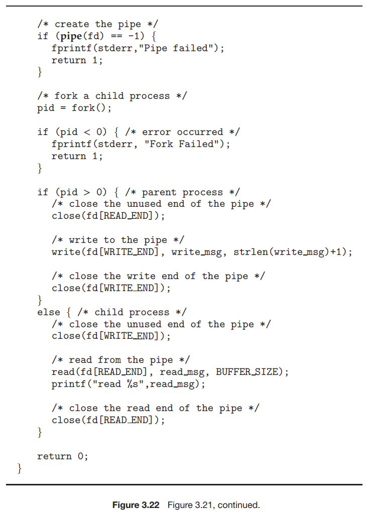 그림 3.21에 나와 있는 UNIX 프로그램에서 부모 프로세스는 파이프를 만든 다음 fork() 콜을 보내 자식 프로세스를 만든다. fork() 호출 후에 발생하는 일은 데이터가 파이프를 통해 어떻게 흐를지에 따라 달라진다. 이 경우, 부모는 파이프에서 쓰고 자식은 파이프에서 읽는다. 부모 프로세스와 자식 프로세스 모두 처음에 파이프의 사용되지 않는 끝을 닫는다는 점을 유의하는 것이 중요하다. 그림 3.21에 나와있는 프로그램은 이 작업이 필요하지 않지만, 작성자가 파이프 끝을 닫았을 때 파이프에서 읽는 프로세스가 파일 끝(read() 가 0을 반환)을 감지할 수 있도록 하는 중요한 단계이다.