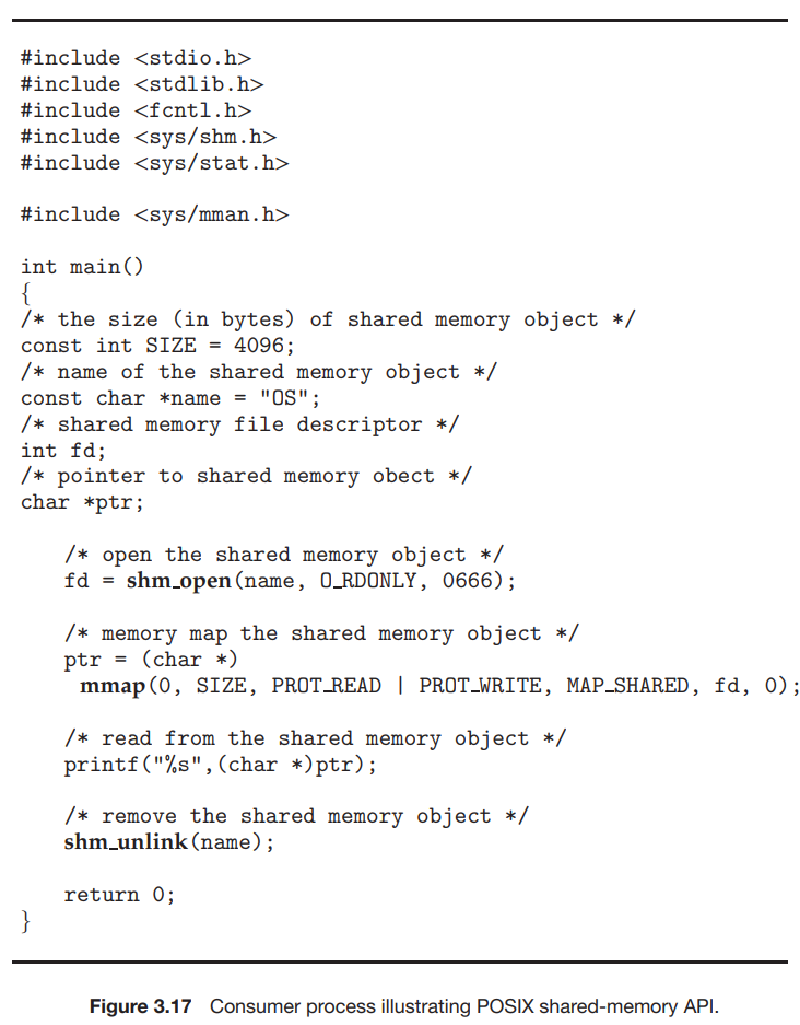 그림 3.17에 나타낸 소비자 프로제스는, 공유 메모리의 내용을 읽고 출력한다. 소비자는 또한 소비자가 접근한 후 공유 메모리 부분을 제거하는 shm_unlink() 함수를 호출한다. 메모리 매핑에 대한 자세한 내용은 13.5장에서 제공한다.