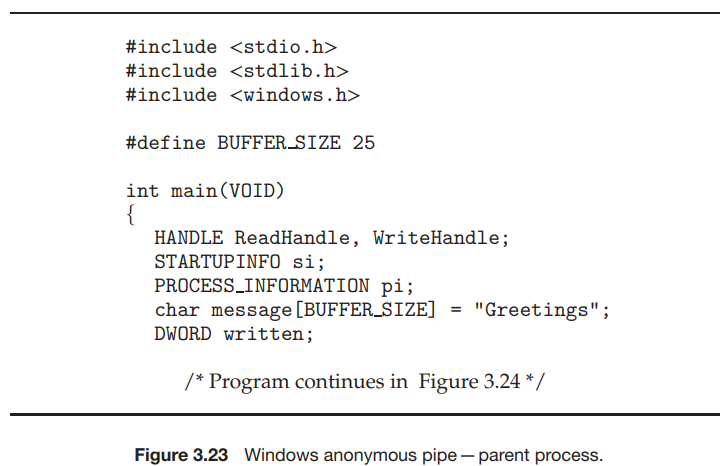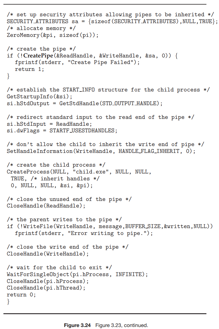 그림 3.23은 부모 프로세스가 자식 프로세스와 통신하기 위해 익명 파이프를 만드는 것을 보여준다. 자식 프로세스가 부모 프로세스가 만든 파이프를 자동으로 상속받는 UNIX 시스템과 달리 Windows에서는 프로그래머가 자식 프로세스가 상속받을 속성을 지정해야 한다. 이는 먼저 SECURITY_ATTRIBUTES 구조를 초기화하여 핸들을 상속할 수 있도록 한 다음 자식 프로세스의 표준 입출력 핸들을 파이프의 읽기 또는 쓰기 핸들로 리다이렉션하여 수행된다. 또한 파이프가 반이중이므로, 자식이 파이프의 쓰기 끝을 상속하는 것을 금지해야 한다.