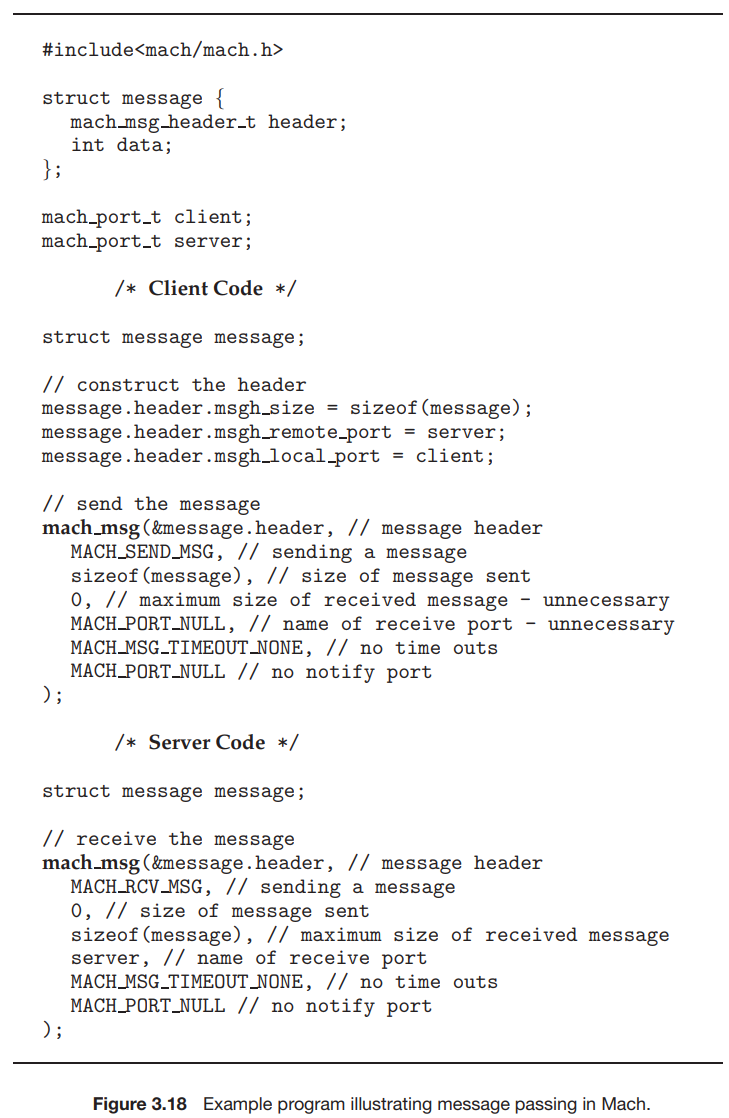 함수 mach_msg() 는 메시지를 보내고 받는 표준 API이다. 함수의 매개변수 중 하나인 MACH_SEND_MSG 또는 MACH_RCV_MSG 의 값은 전송 작업인지 수신 작업인지를 나타낸다. 이제 클라이언트 작업이 서버 작업에 간단한 메시지를 보낼 때 어떻게 사용되는지 보여주겠다. 클라이언트와 서버 작업에 각각 연결된 두 개의 포트(클라이언트와 서버)가 있다고 가정한다. 그림 3.18의 코드는 클라이언트 작업이 헤더를 구성하고 서버에 메시지를 보내는 것과 서버 작업이 클라이언트에서 보낸 메시지를 수신하는 것을 보여준다.