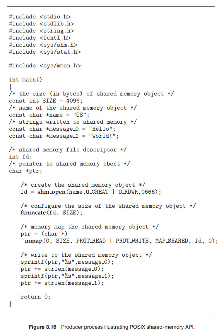 그림 3.16과 그림 3.17에 나타낸 프로그램은 공유 메모리를 구현하는 데 생산자-소비자 모델을 사용한다. 생산자는 공유 메모리 객체를 설정하고 공유 메모리에 쓰고, 소비자는 공유 메모리에서 읽는다.