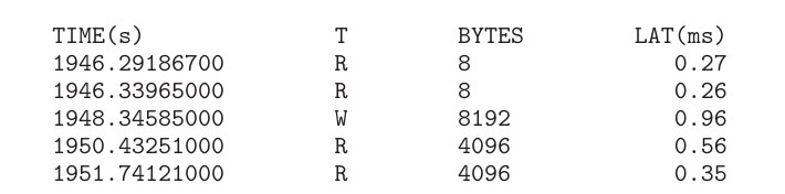 이 출력은 I/O작업이 발생됐을 때의 타임스탬프, I/O가 Read 또는 Write 작업인지, 그리고 몇 바이트가 I/O에 포함되었는지 말해준다. 마지막 열은 I/O의 지속시간(지연시간 또는 LAT로 표현)을 밀리초로 반영한다.