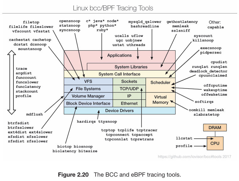 BCC를 특히 강력하게 만드는 것은 그 툴이 시스템 해를 끼치지 않고 중요한 애플리케이션을 실행하는 라이브 프로덕션 시스템에서 사용될 수 있다는 것이다. 이는 특히 시스템 성능을 모니터하여 병목현상이나 보안 악용을 식별해야하는 시스템 관리자에 유용하다. 그림 2.20은 현재 BCC와 eBPF가 제공하는 광범위한 툴과 Linux 운영 체제의 모든 영역을 본질적으로 추적할 수 있는 기능을 보여준다. BCC는 새 기능이 끊임없이 추가되는 빠르게 변화하는 기술이다.