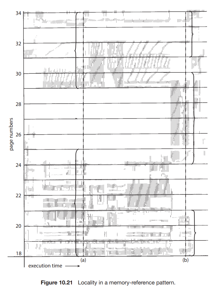 (a)시점에서 지역성은 {18,19,20,21,22,23,24,29,30,33} 페이지 집합이다. (b)시점에서 지역성은 {18,19,20,24,25,26,27,28,29,31,32,33}으로 변경된다. 일부 페이지(예: 18,19,20)가 두 지역성에 모두 속하므로 중복되는 부분이 있을 수 있다.