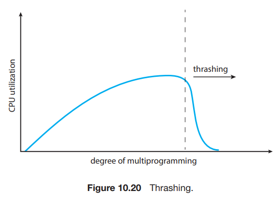 이러한 높은 페이징 활동을 thrashing이라고 한다. 프로세스가 실행 시간보다 페이징에 더 많은 시간을 소모하는 경우, 프로세스가 스래싱을 겪고 있다고 한다. 스래싱은 심각한 성능 문제를 야기한다.