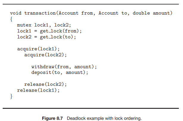 또한, lock 순서를 부과하는 것이 데드락 방지를 보장하지 않는다는 점도 중요하다 lock을 동적으로 획득할 수 있는 경우에. 예를 들어, 두 계좌 간에 자금을 이체하는 함수가 있다고 가정해보면, race condition을 방지하기 위해, 각 계좌에는 그림 8.7과 같은 get_lock() 함수에서 얻은 mutex lock이 있다. deadlock은 두 개의 스레드가 동시에 transaction() 함수를 호출하여, 다른 계좌와 전치하는(바꾸어 넣는) 경우 발생할 수 있다. 즉, 한 스레드가 transaction(checking_account, savings_account, 25.0)을 호출할 수 있고, 다른 계좌가 transaction(savings_account, checking_account, 50.0)을 호출할 수 있다.