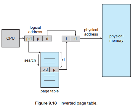 이 문제를 해결하기 위해, inverted page table을 사용할 수 있다. 역 페이지 테이블에는 메모리의 각 실제 페이지에 대한 항목이 하나씩 있다. 각 항목은 실제 메모리 위치에 저장된 페이지의 가상 주소와 페이지를 소유한 프로세스의 정보로 구성된다. 따라서, 시스템에는 페이지 테이블이 하나만 있으며, 물리적 메모리의 각 페이지에 대한 항목이 하나만 있다. 그림 9.18은 역 페이지 테이블의 작동을 보여준다.
